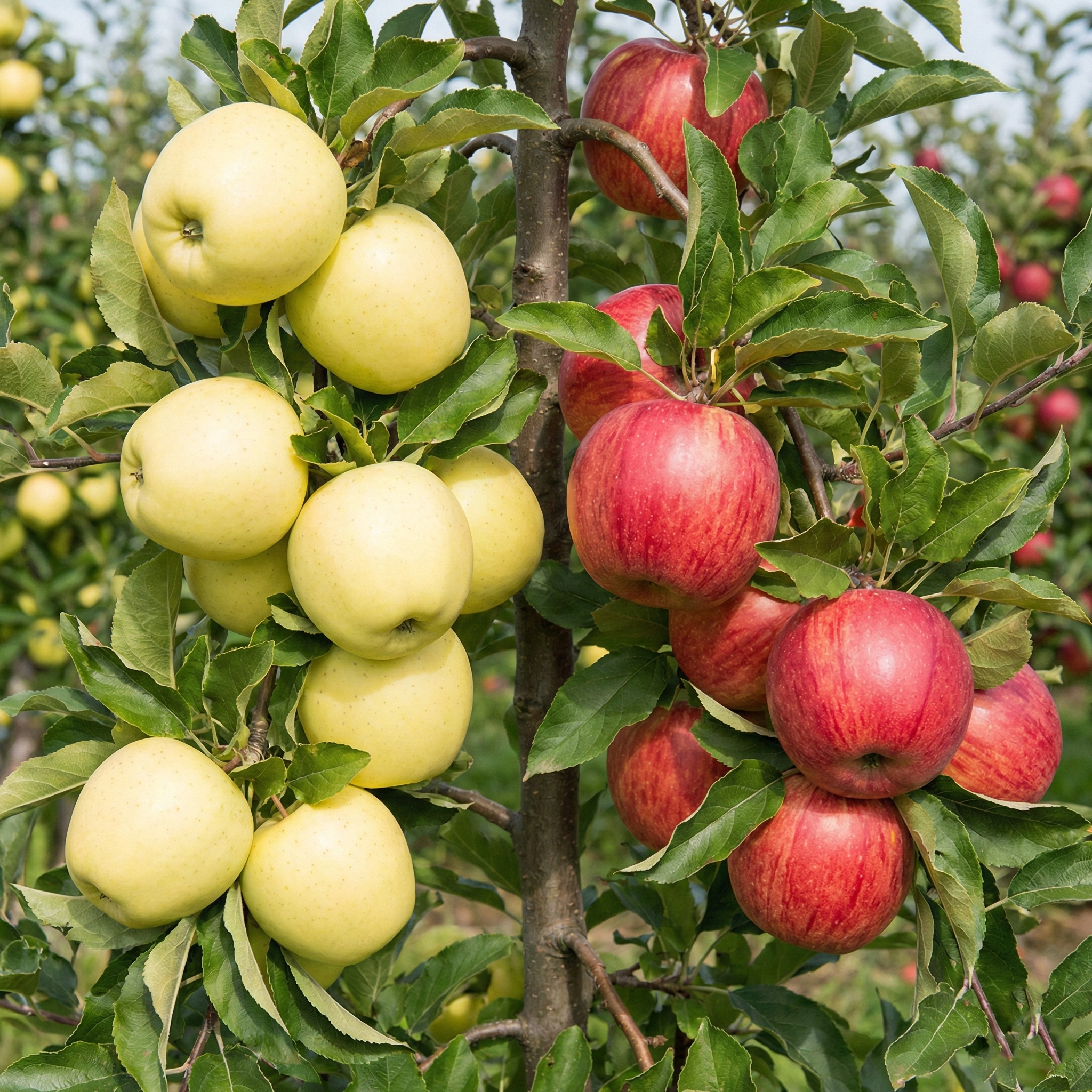 ✅ Owoce: Golden Delicious – duże, złocisto-żółte, soczyste i aromatyczne, bardzo atrakcyjne wizualnie; Idared – średnie lub duże, czerwono-zielone, chrupiące, lekko kwaskowate, idealne do przechowywania i przetworów