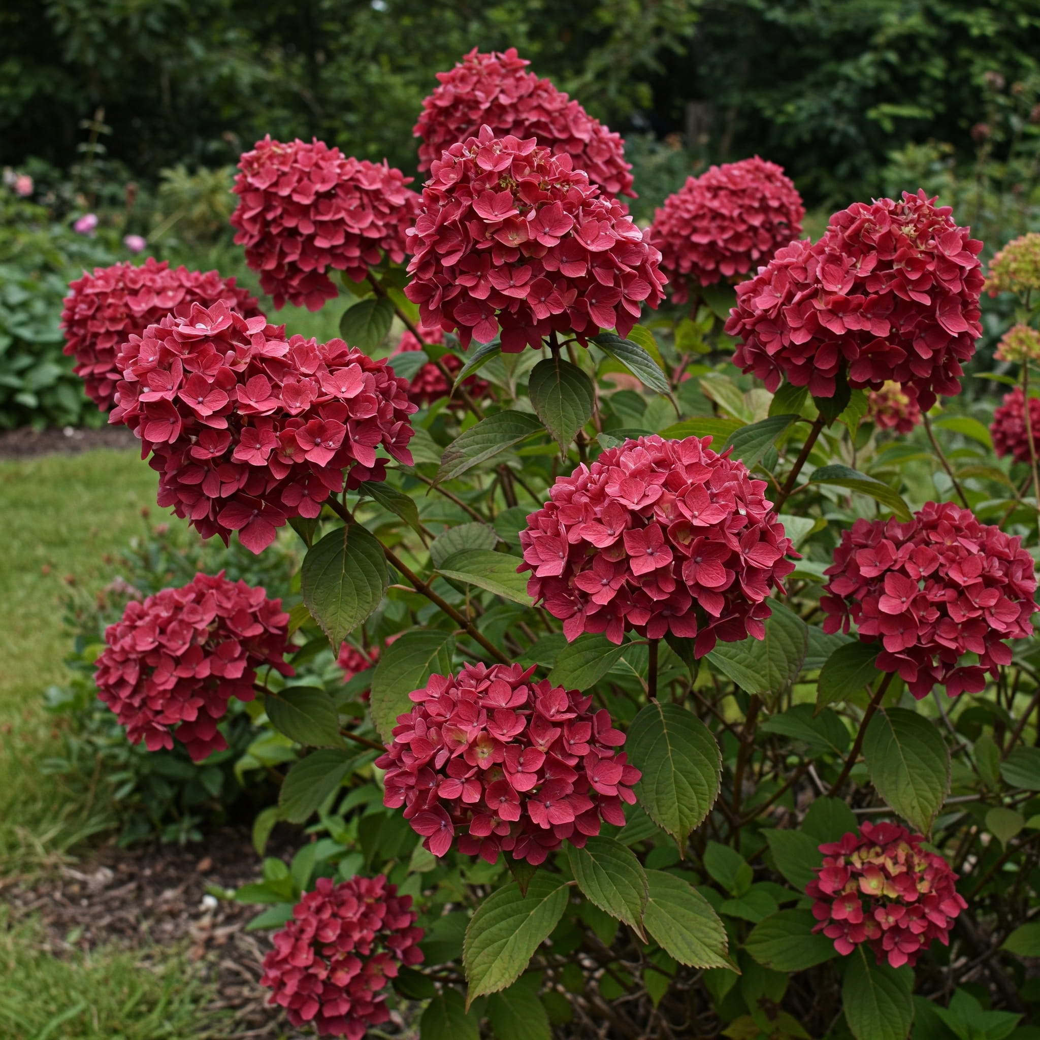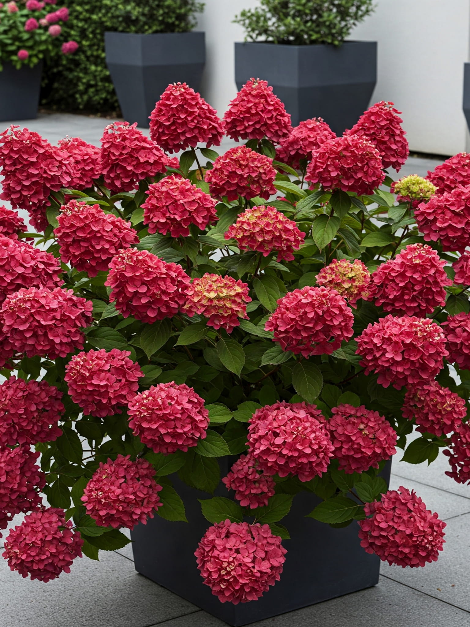 Ta niska hortensja bukietowa zachwyca wyjątkową intensywnością barw – jej kwiatostany rozwijają się jako kremowobiałe, po czym szybko przebarwiają się na głęboki róż, a późnym latem nabierają nasyconych czerwonych tonów. Wszystko to dzieje się na tle kontrastujących, ciemnych pędów, co sprawia, że roślina wygląda niezwykle efektownie nawet z daleka. Krzew jest niski, zwarty i doskonale nadaje się do sadzenia w donicach, na tarasach lub w mniejszych ogrodach. Kwitnie długo i obficie, jest w pełni odporny na mróz i łatwy w uprawie. To świetny wybór dla tych, którzy szukają hortensji o intensywnych kolorach i kompaktowym rozmiarze.