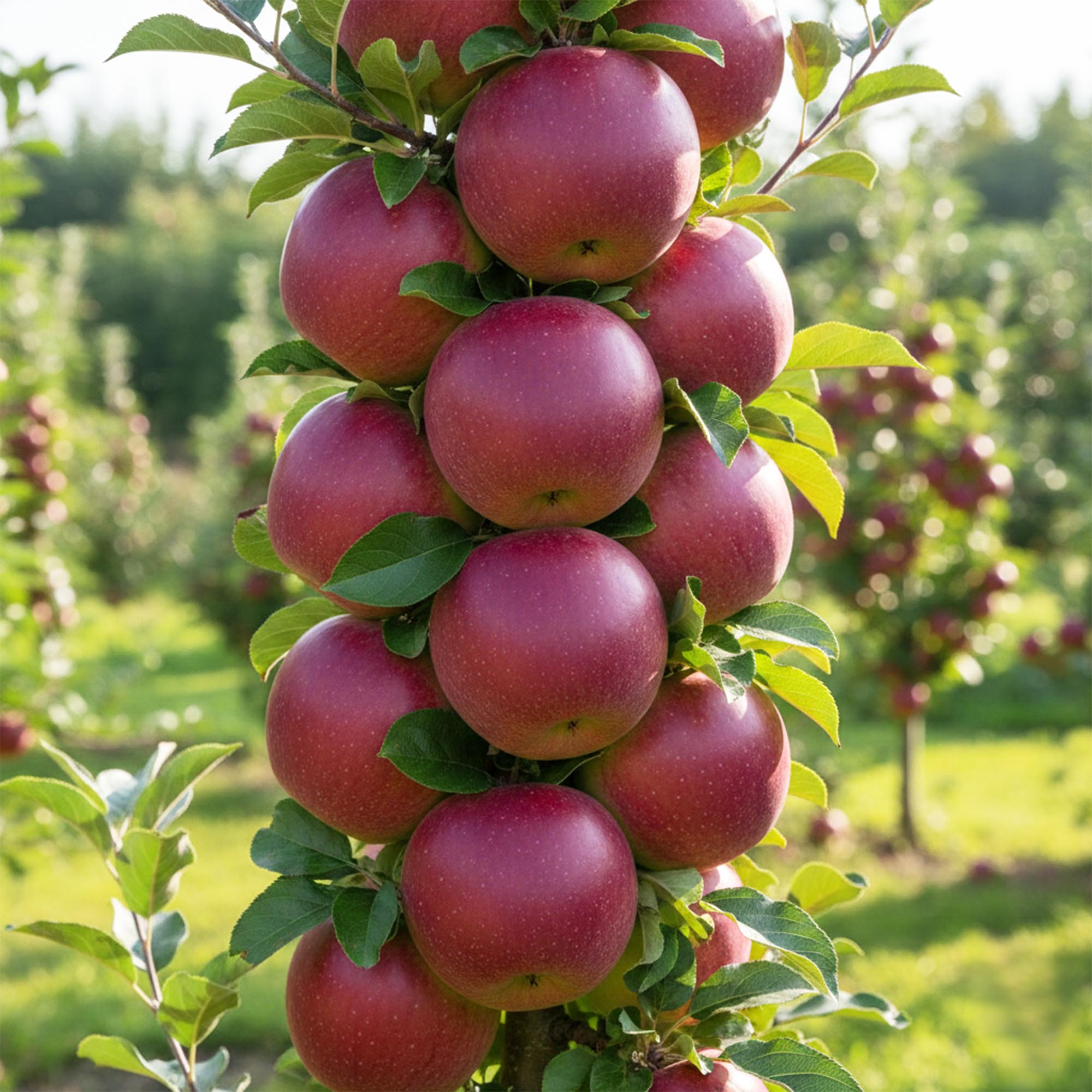 Jabłoń KOLUMNOWA CZERWONA: Jest to odmiana kolumnowa, która sprawdzi się w każdym ogrodzie. Ma smaczne owoce, które także cieszą oczy apetycznym wyglądem. Drzewa można sadzić w niedalekiej odległości od siebie, optymalnie nawet co 80 cm. Pozwala to zaoszczędzić miejsce w sadzie. Dorastają do wysokości 2 – 3 metrów. Drzewo nie wytwarza długopędów, a tylko pień przewodni i krótkopędy. Pierwszych owoców możemy spodziewać się w trzecim roku od posadzenia. Skórka wybarwia się na czerwono wraz z dojrzałością owoców. Skórka jest ładnie błyszcząca. W smaku są słodkie i soczyste. Można je zjadać bezpośrednio, ale też przetwarzać i suszyć. Dobrze się też przechowują.