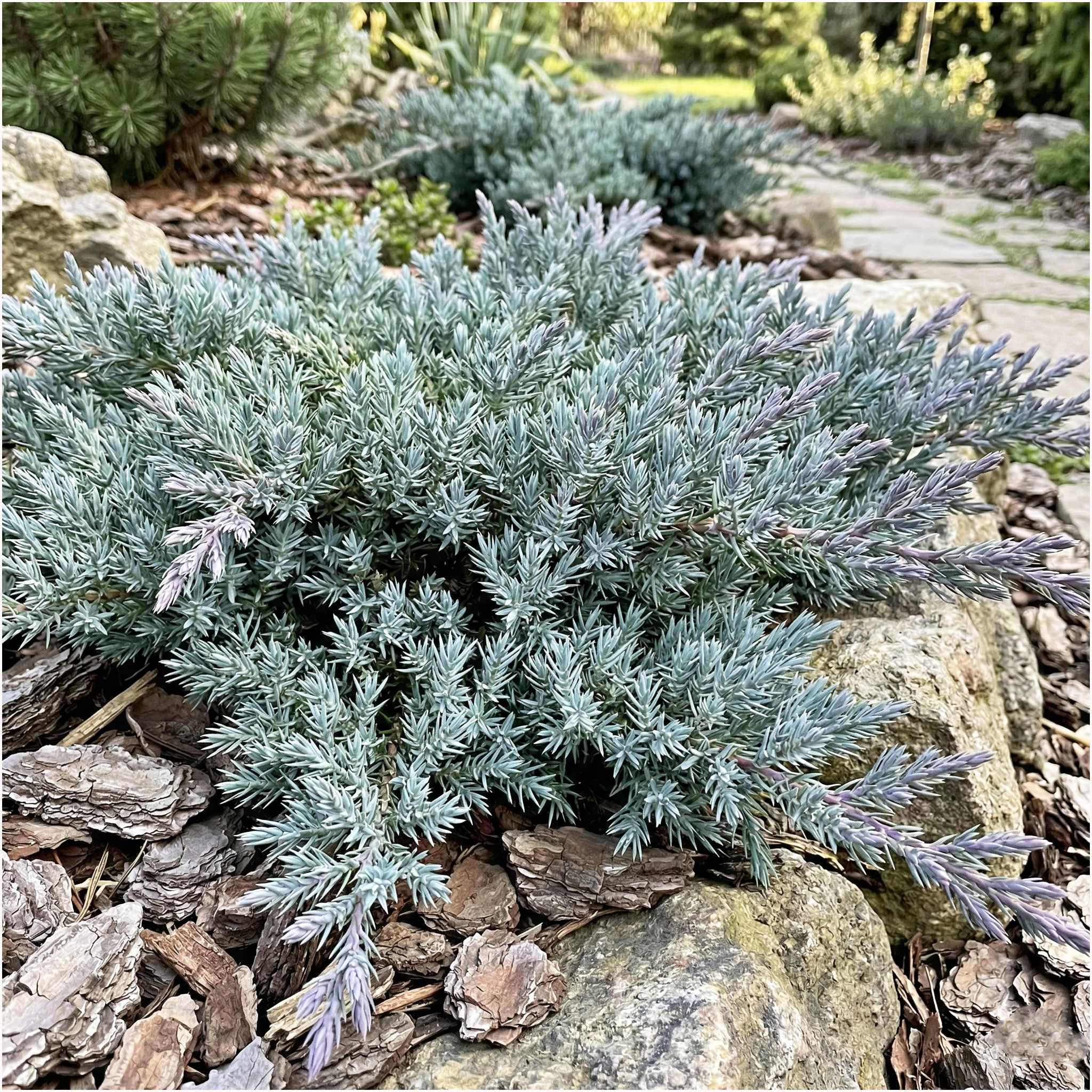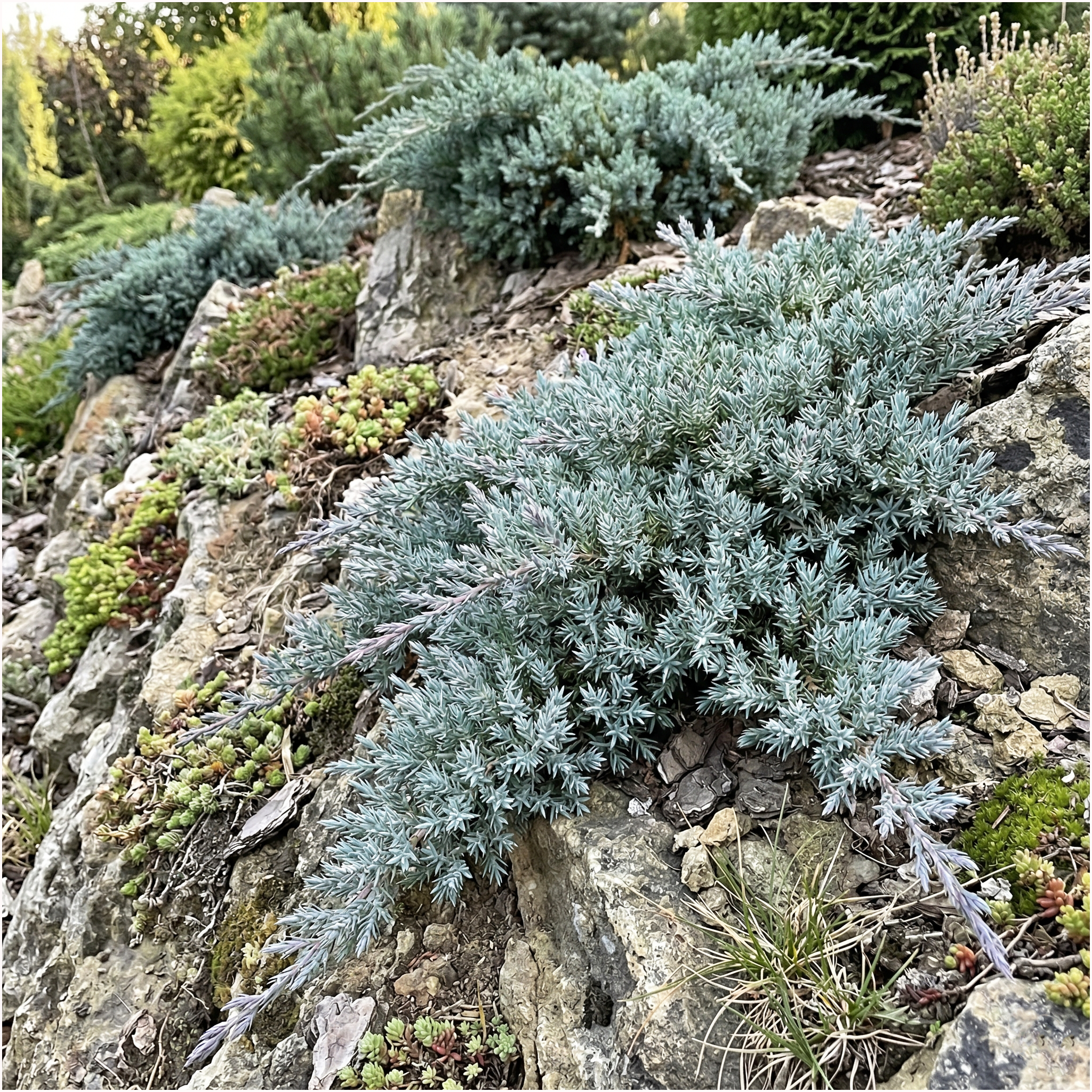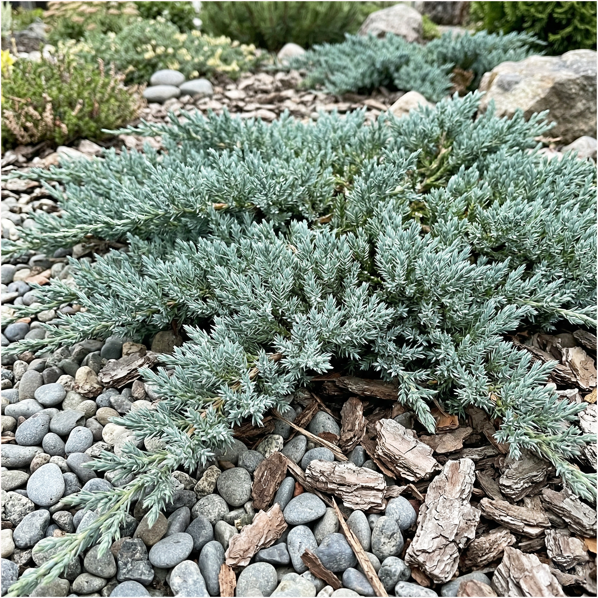 Jałowiec płożący ‘Grey Pearl’ to niska, gęsto i równomiernie rozrastająca się roślina iglasta o bardzo eleganckim, spokojnym charakterze, która z czasem tworzy zwarte, miękkie kobierce o subtelnym, srebrzysto-szaroniebieskim wybarwieniu. Jego pędy pełzają nisko przy ziemi, rozkładając się szeroko i harmonijnie, a ich delikatnie łukowaty układ sprawia, że cała roślina prezentuje się naturalnie i lekko, mimo zwartej formy. Dzięki temu jałowiec doskonale pokrywa podłoże, skutecznie ograniczając rozwój chwastów i sprawdzając się jako niezawodna roślina okrywowa o wysokich walorach dekoracyjnych. Przez cały rok zachowuje swoją atrakcyjność – wiosną i latem jego igły przybierają chłodny, srebrzysto-niebieski odcień, który pięknie kontrastuje z intensywną zielenią innych roślin, natomiast zimą barwa staje się nieco głębsza i bardziej stonowana, z delikatnymi szaro-stalowymi tonami, dzięki czemu roślina nadal zdobi ogród w okresie spoczynku. Jest to gatunek wyjątkowo odporny na trudne warunki – dobrze znosi suszę, mróz oraz ubogie, przepuszczalne gleby, co sprawia, że jest łatwy w uprawie i niewymagający w pielęgnacji. Najlepiej rozwija się na stanowiskach słonecznych, gdzie jego srebrzyste wybarwienie staje się najbardziej wyraziste i efektowne. W sprzyjających warunkach szybko się rozrasta, tworząc jednolite, eleganckie „dywany”, które doskonale sprawdzają się na skarpach, rabatach, w ogrodach skalnych oraz w nowoczesnych i minimalistycznych kompozycjach ogrodowych. Dzięki swojej trwałości i subtelnej kolorystyce ‘Grey Pearl’ jest jedną z najbardziej eleganckich i uniwersalnych odmian jałowca płożącego.