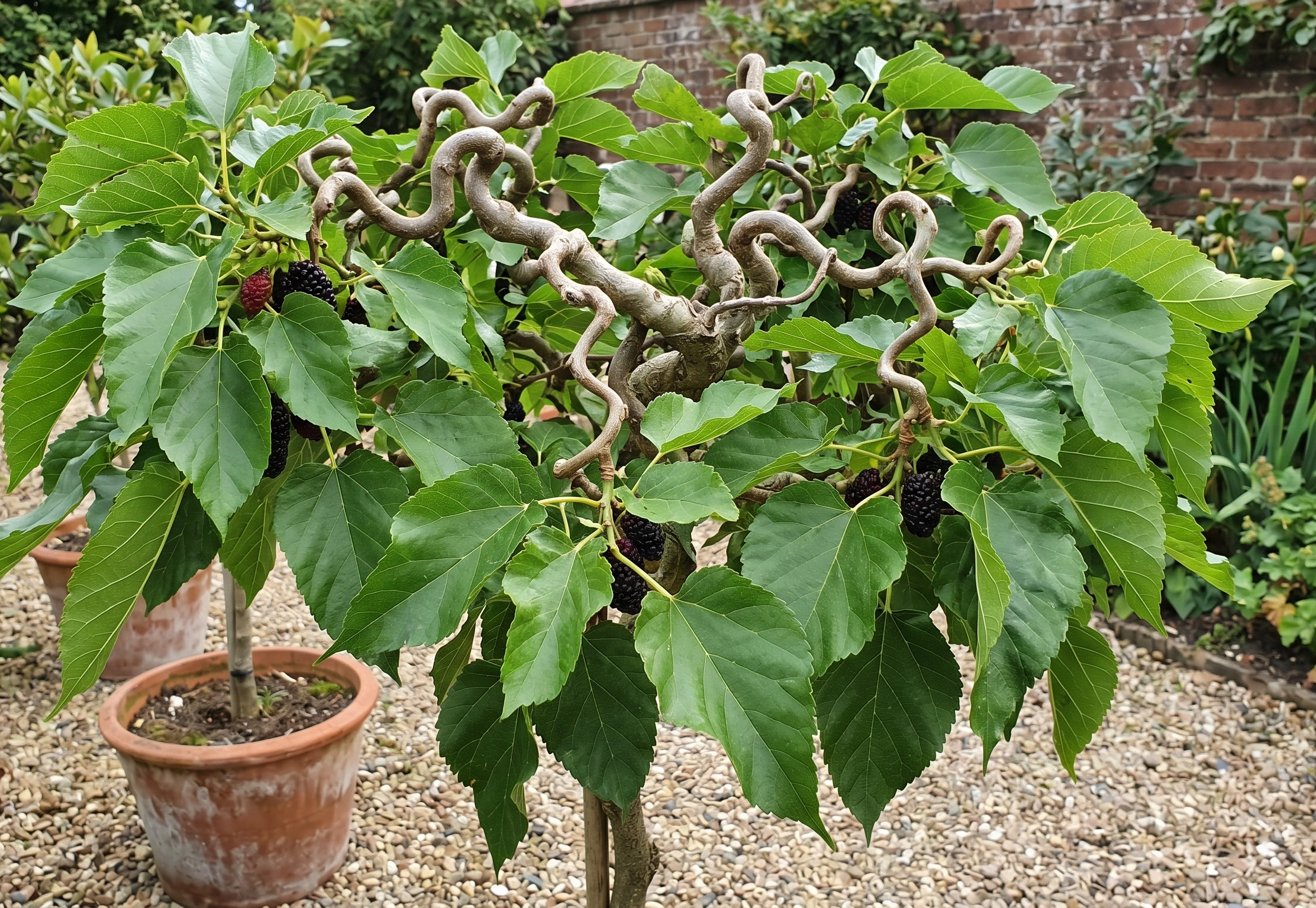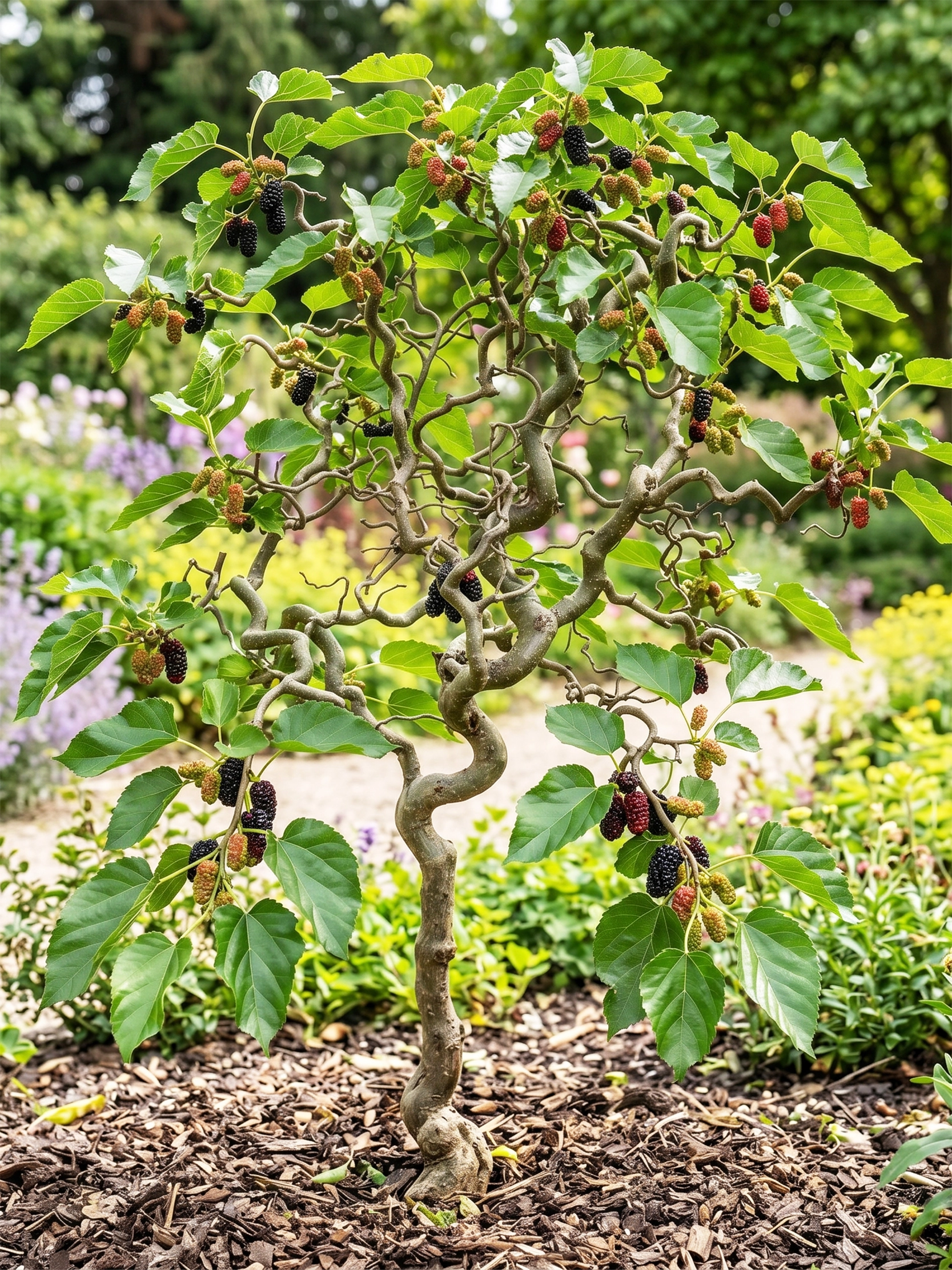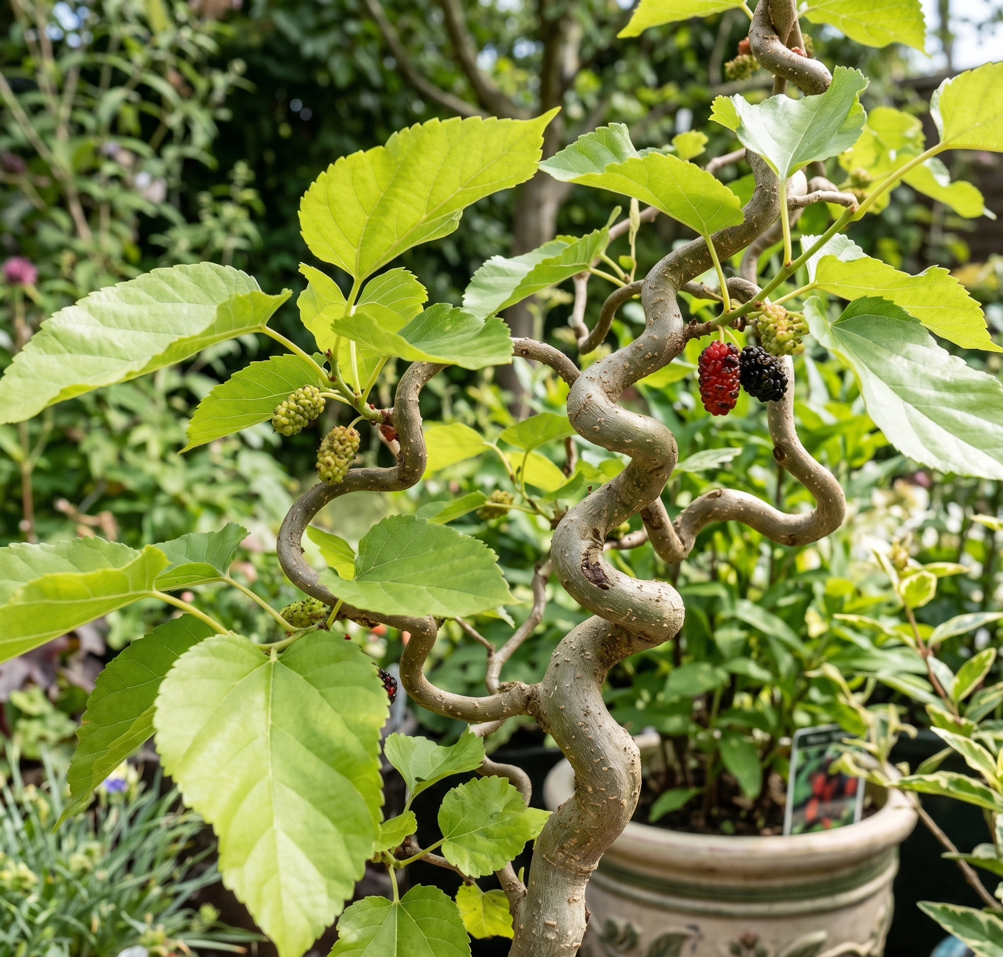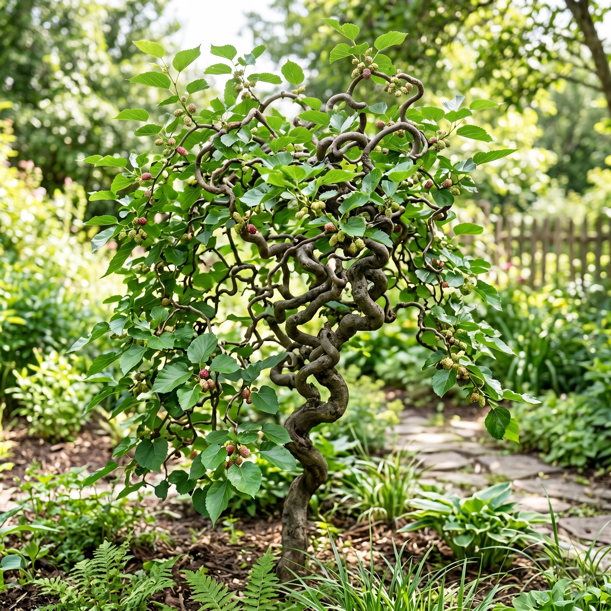 Morwa 'Spirata' (często klasyfikowana jako Morus alba lub Morus latifolia) to wyjątkowo dekoracyjna odmiana, która wyróżnia się fantazyjnie powyginanymi, zygzakowatymi pędami. Nadają one roślinie unikalny, rzeźbiarski wygląd, który staje się główną ozdobą ogrodu szczególnie w okresie zimowym, po opadnięciu liści. W sezonie wegetacyjnym drzewko pokrywa się dużymi, błyszczącymi i soczyście zielonymi liśćmi, tworząc bardzo gęstą, nieregularną koronę.