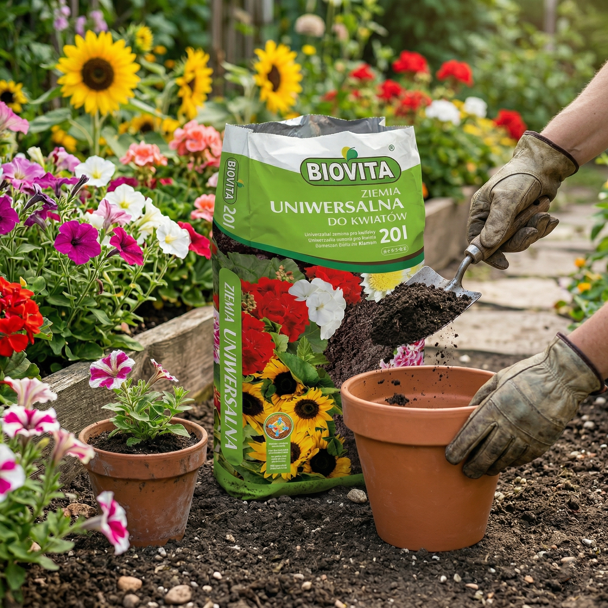 Ziemia uniwersalna 20L BIO BIOVITA doskonale sprawdza się zarówno przy sadzeniu nowych roślin, jak i do przesadzania starszych okazów. Jest to ekologiczne, wygodne i skuteczne rozwiązanie dla wszystkich, którzy chcą cieszyć się zdrowymi, pięknymi i bujnie kwitnącymi kwiatami przez cały sezon.